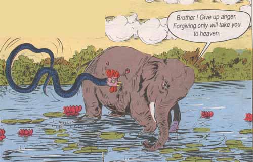The snake bit Gajpati on his stomach, pouring poison. This gave Gajpati unbearably painful burning sensations. but he remembered the sage's advice and so he told the snake-