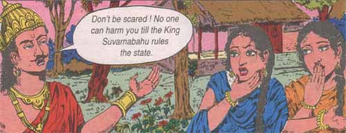 On hearing his name, King Suvarnabahu appeared from hideout. Seeling a handsome youth, the girls got scared. The king reassured them -
