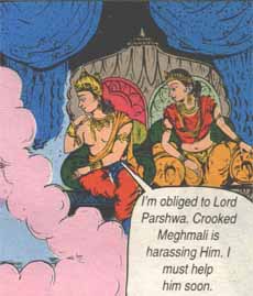 This made the throne of Dharanendra shake up. Dharanendra sensed the mischief of Meghmali.